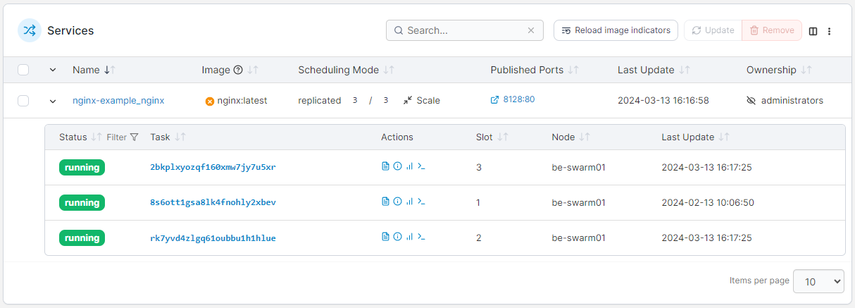 You can also see the image update indicator for each service in the stack. To recheck the image update status for all services in the stack you can click the Reload image indicators button, or to recheck a single service's image, click the image update indicator icon for that service.&#x20;