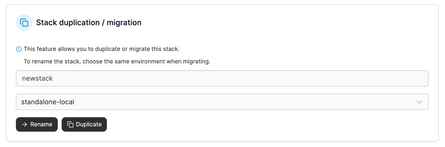 In the Stack duplication / migration section, select the destination environment for the stack, and optionally define a new name for the stack. Click Migrate.
