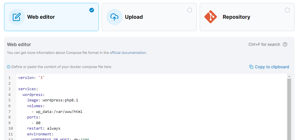 The Web editor will be pre-populated with the Compose file for your stack. Make any changes you need here.