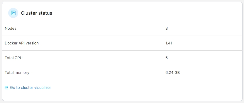This page provides information about the Docker Swarm cluster for the selected environment. The page is split into the following sections: Cluster status and Nodes, with clicking a node name taking you to the Node overview for that node.