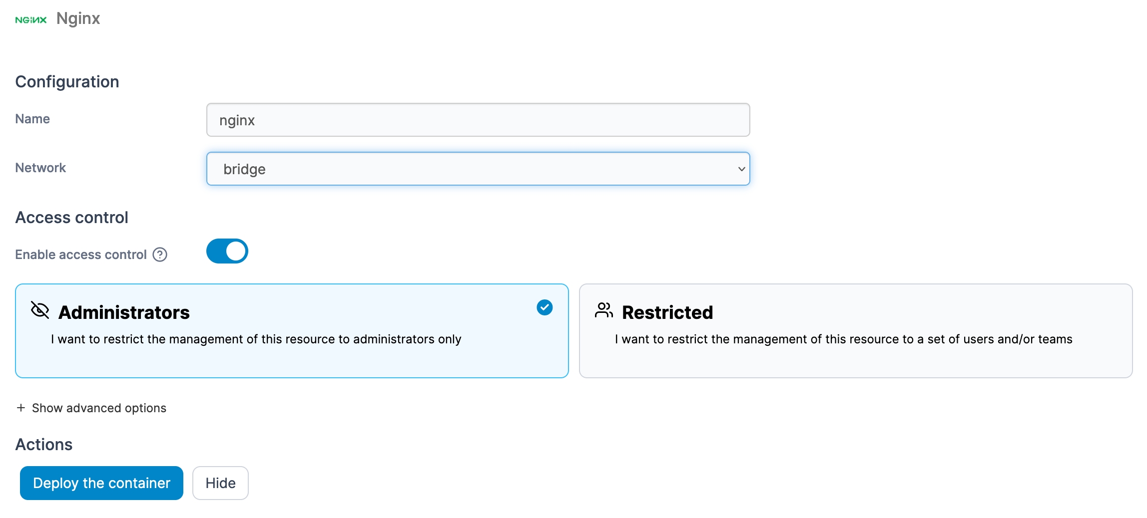 Then, select the container template you want to deploy. Define a name, a network, port mapping and volumes, and toggle Enable access control on if needed.