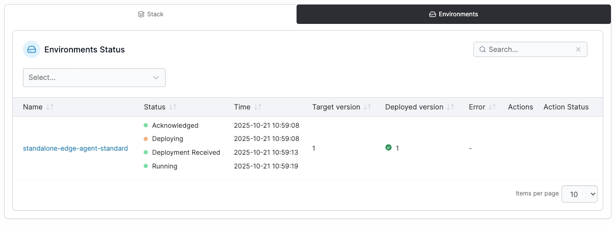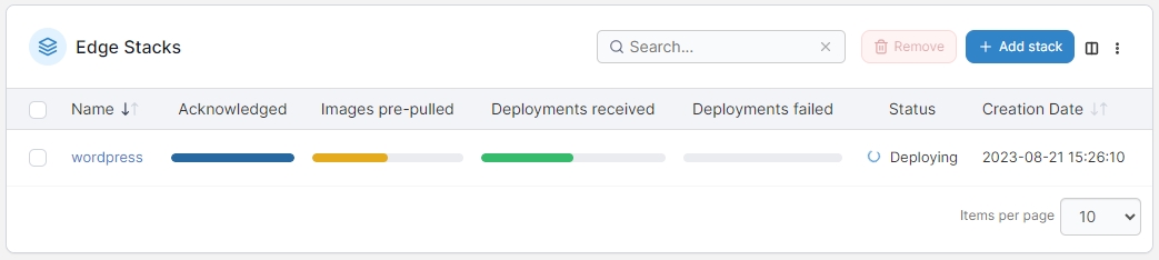 The Edge Stacks page displays a list of Edge Stacks deployed across your environments and devices and includes their name, the status of the deployment across the relevant environments (acknowledged, images pre-pulled, deployments received and failed, as well as a generic status) and the creation date. You can hover over each of the bars for more detail.