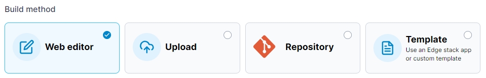 For the Web editor, Upload and Template build methods you can choose to enable an Edge Stack webhook. This webhook will allow you to trigger updates to the stack by sending a POST request to a specific URL, instructing Portainer to pull the most up to date version of the associated image and re-deploy the stack.