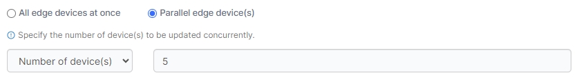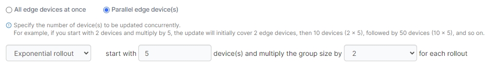 If Parallel edge device(s) is selected, you can choose to either deploy in static group sizes or in an exponential rollout strategy. For static group sizes, choose the Number of device(s) option and specify your group size.