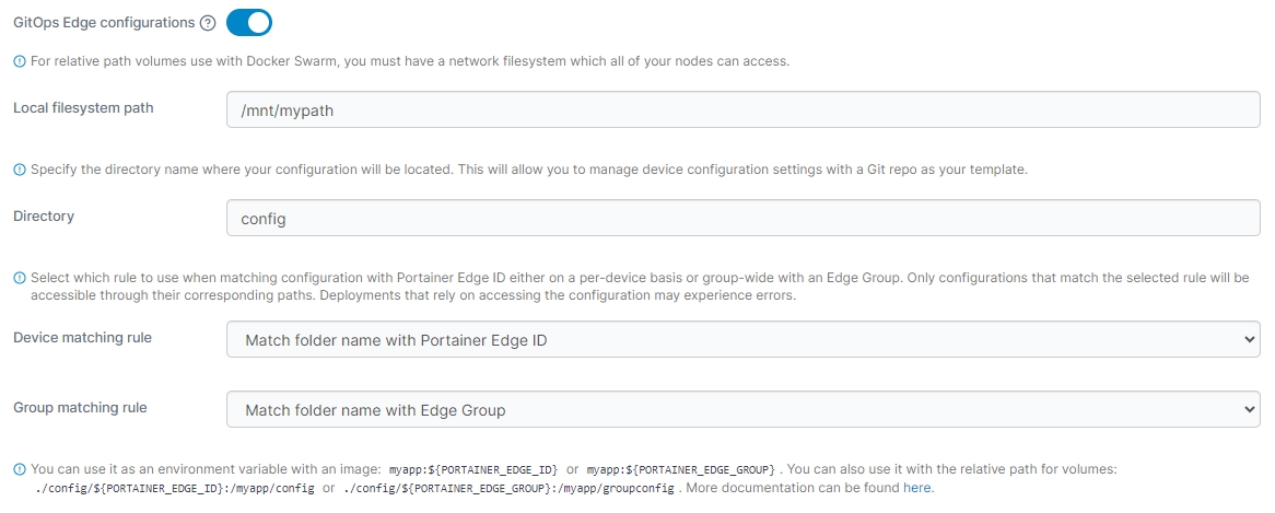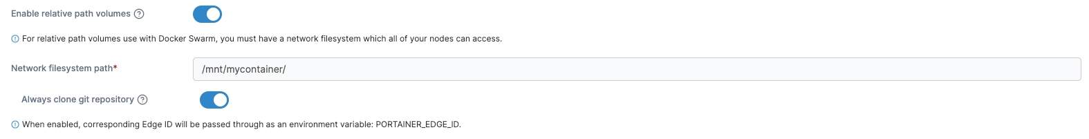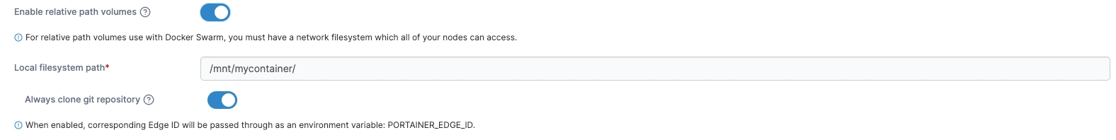 When you toggle Enable relative path volumes to on, you are able to specify relative path references in your compose files. Portainer will create the required directory structure and populate the directories with the relevant files from your Git repository. This feature is only available for Docker Standalone and Docker Swarm environments.