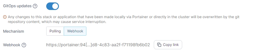 Portainer supports automatically updating your Edge Stacks deployed from Git repositories. To enable this, toggle on GitOps updates and configure your settings.