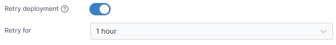 If a deployment of an Edge Stack fails (for example if the remote Edge environment is unavailable), by default Portainer will not try and redeploy the stack. If you wish to enable retrying of failed deployments, you can toggle Retry deployment to on and set Retry for to the length of time you want Portainer to retry deploying the stack.