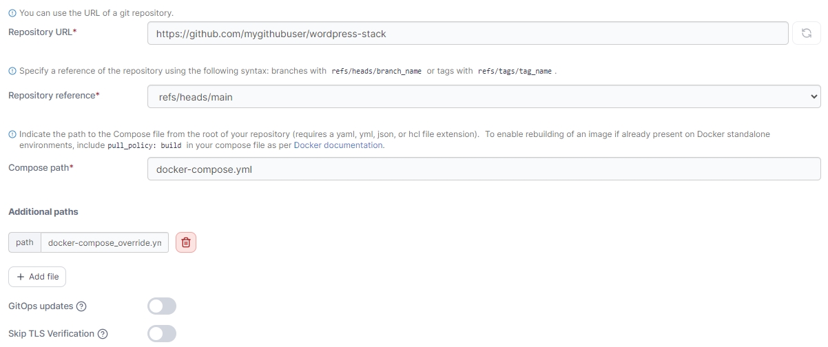 With relative path volumes enabled, you can also toggle Always clone git repository. Enabling this option ensures that the Git repository is always cloned for any relative paths defined in your Compose files. The referenced content is then pulled directly from your Git repository to the environment where the stack is deployed.