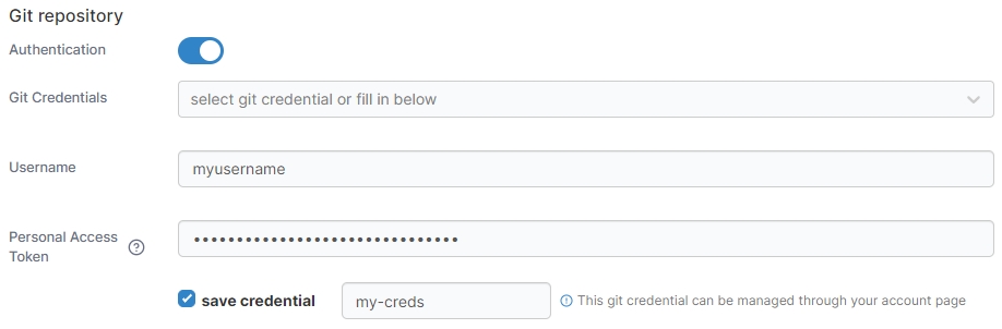 If the Authentication toggle is enabled and you have configured individual or shared Git credentials, you can select them from this dropdown. Shared Git credentials can be identified with the Shared tag, and are only available to administrators at present. Leave this field unset to provide new credentials.
