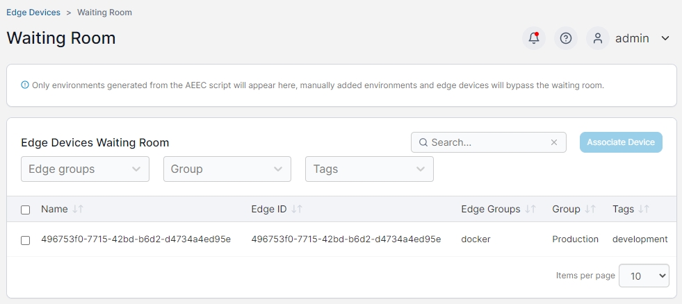 The Edge Devices Waiting room lists any Edge Devices that have connected using the pre-deploy script and are pending association with the Portainer instance. The list can be filtered by Edge Group, group, and tag.