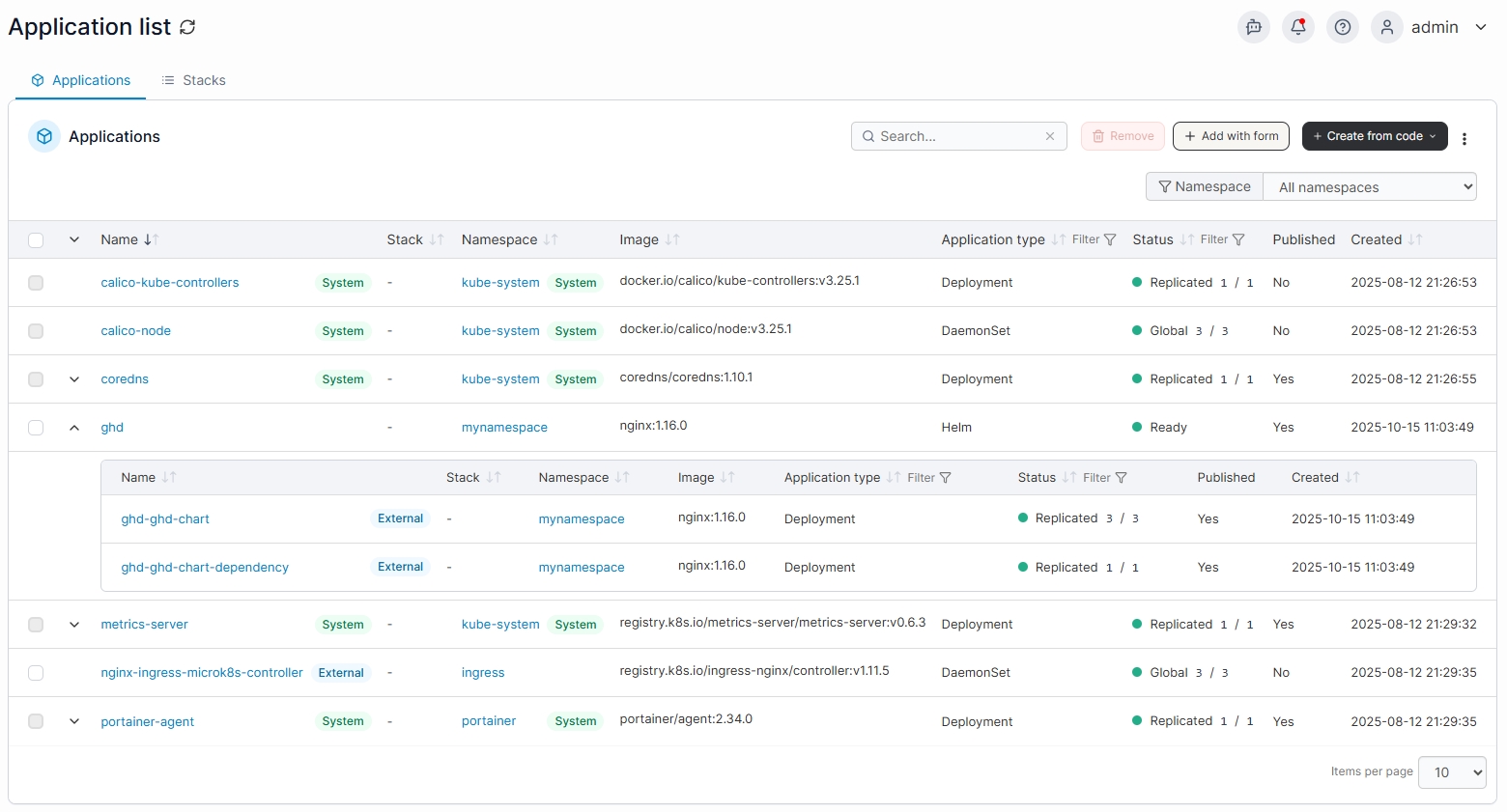Portainer lets you add applications either using a form or through code (for example a manifest or a Helm chart):
