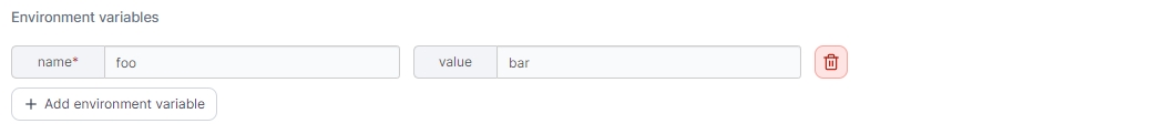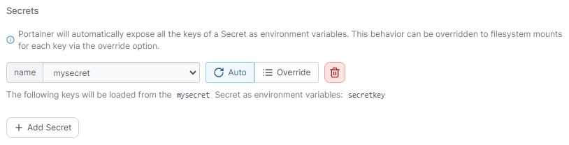 Select any secrets you have previously created to make them available to the application. Portainer will automatically expose all the keys of a secret as environment variables. This behavior can be overridden to filesystem mounts for each key via the Override button.