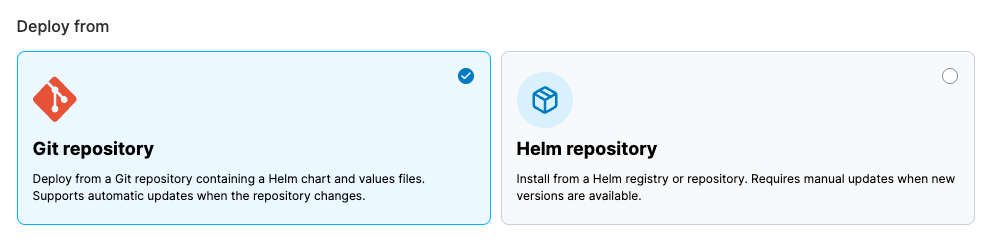 In the popup that appears, choose whether to edit using deployment details from a **Git repository** or a **Helm repository**. This option defaults to the method originally used when creating the application, but you can change it if needed.