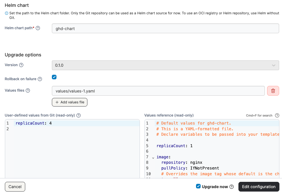 **User-defined values from Git** and the **Values reference** are displayed side by side, showing the values that will be applied during the upgrade. These views are read-only. You can expand the **Manifest preview** section below the values comparison to display a preview of the resulting merged manifest.