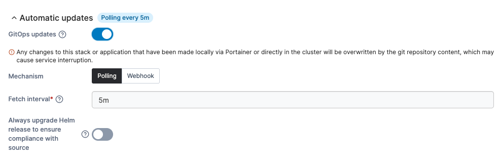 You can modify Automatic update options from this view. If **GitOps updates** are enabled, a tag showing the configured update timeframe is displayed next to the title. Click the **Automatic updates** title to expand the section and edit the settings.