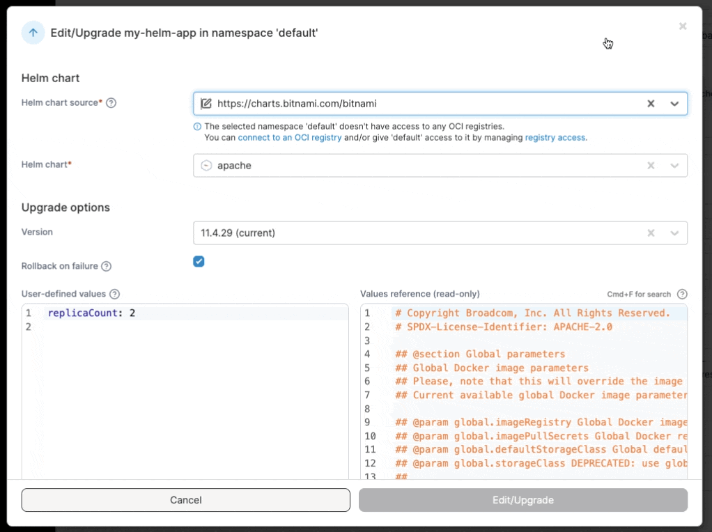 To make changes to, upgrade, or downgrade a Helm deployment, click **Edit/Upgrade**.