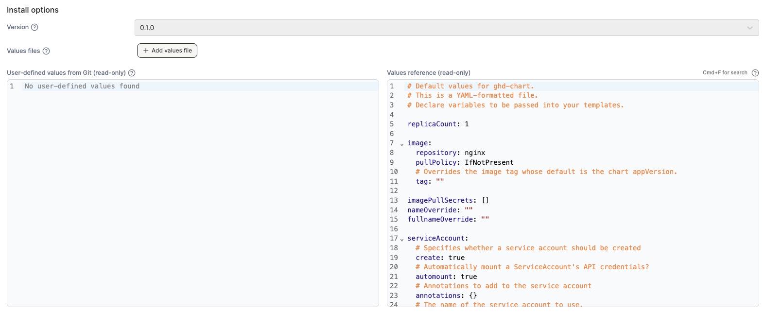 Under Install options, you can view the Version of the Helm chart as defined in the Chart.yaml file from the specified Helm chart path. This field is read-only and cannot be changed.