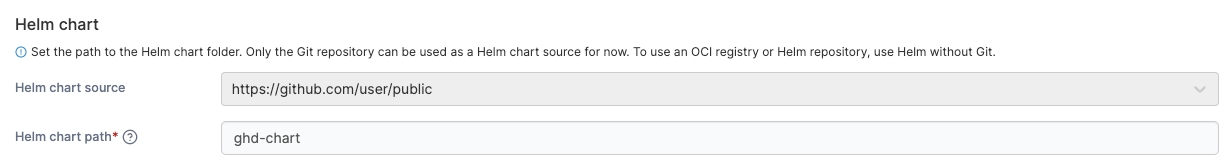 From the dropdown, select the Helm chart source you want to pull from, and enter the Helm chart path. The path must point to a folder that includes a Chart.yaml file.