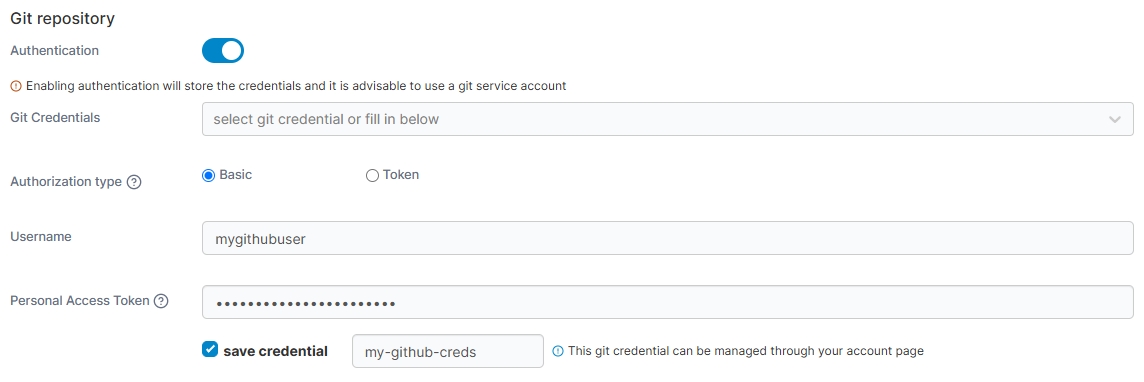 Select either Basic or Token authorization depending on what your Git repository requires. For example, GitHub, GitLab, and Bitbucket Cloud expect Basic Auth, even when using an API or access token.