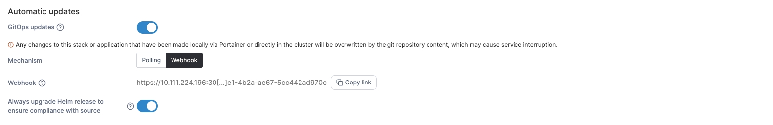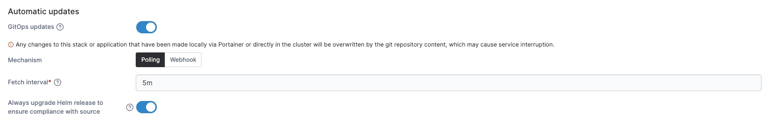 Enabling GitOps updates gives Portainer the ability to update your application automatically, either by polling the repository at a defined interval for changes or by using a webhook to trigger an update.
