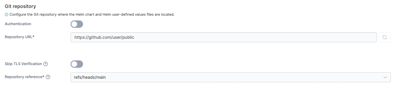 Use the provided fields to enter the details of your Git repository containing your Helm chart and values files.