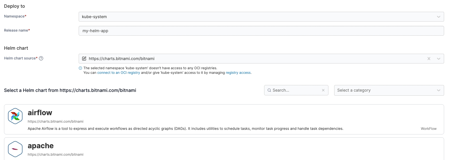 When creating an application from a Helm chart, you can deploy it from either a Git repository or a Helm repository. First, select your deployment method in the Deploy from section.
