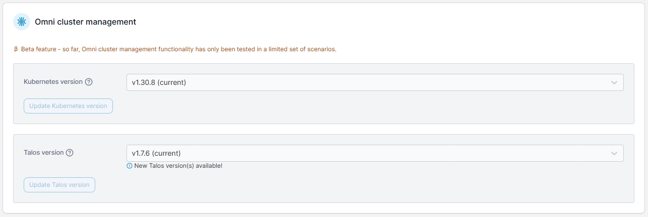 In this section you can see and update the versions of Kubernetes and Talos on your Talos Kubernetes cluster provisioned by Portainer.