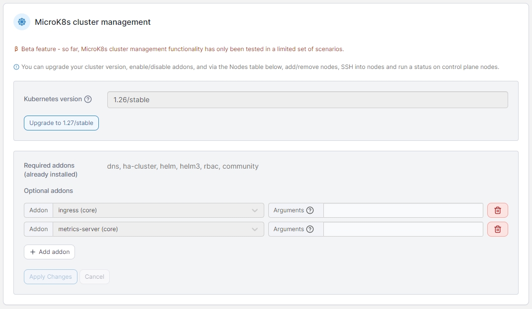 In this section you can see and make changes to the configuration of your MicroK8s cluster provisioned by Portainer.