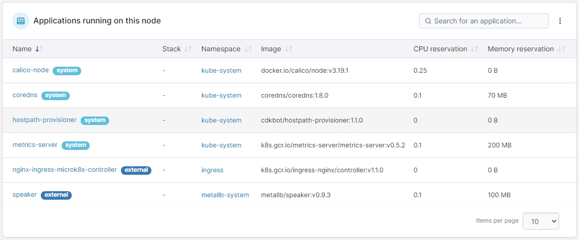 This section provides information about the applications running on the selected node. Clicking the application name will take you to the application details page for that application.