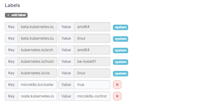 This section lists the labels that apply to the node. You can add additional labels if required, as well as edit non-system labels.