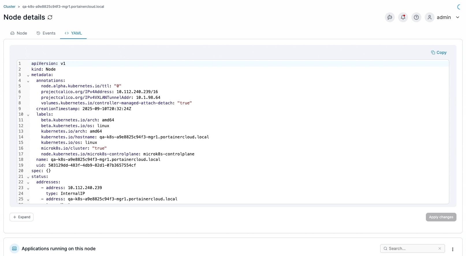 This section shows the node YAML within an editor. To apply any changes you make within the YAML editor, select the Apply changes button, and select Apply changes if you are sure. Changes are made by calling the Kubernetes API to patch the relevant resources. Any resource removals or unexpected resource additions that you make in the YAML will be ignored. Note that editing is disabled for resources in namespaces marked as system.