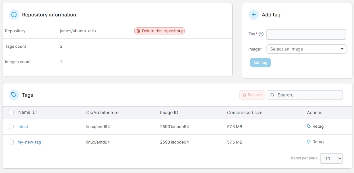 The Repository information page provides the repository name, tag and image count, as well as a list of all tags. You can retag an image in order to promote it through the deployment lifecycle, or simply add or remove tags to annotate changes or usage.