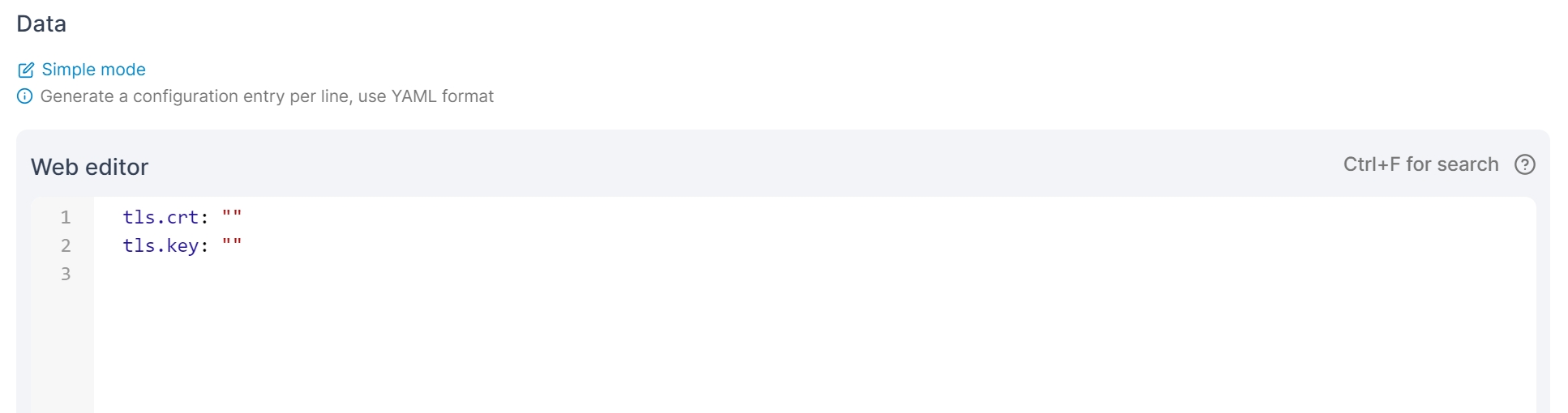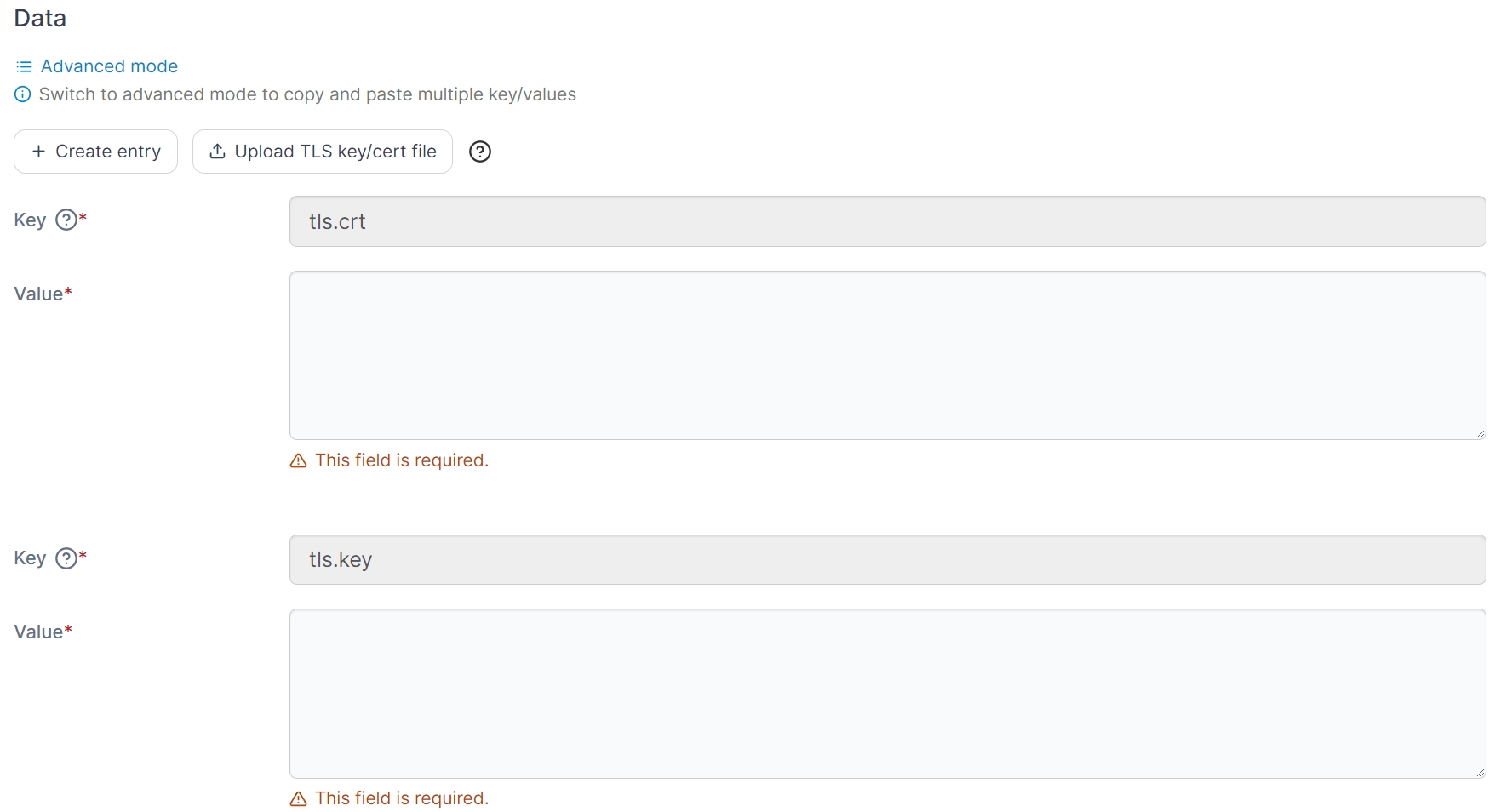 Data fields change to reflect the type of Data to be entered based on the secret type selection above. In the Data section you can enter the details of your secret, in either Simple mode or Advanced mode. Under simple mode you can add entries in a key and value format, and in advanced mode you can paste in multiple values in YAML format.