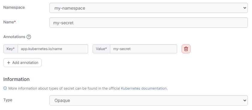 You can add annotations to your secret as required by clicking Add annotation and filling in the Key and Value fields.