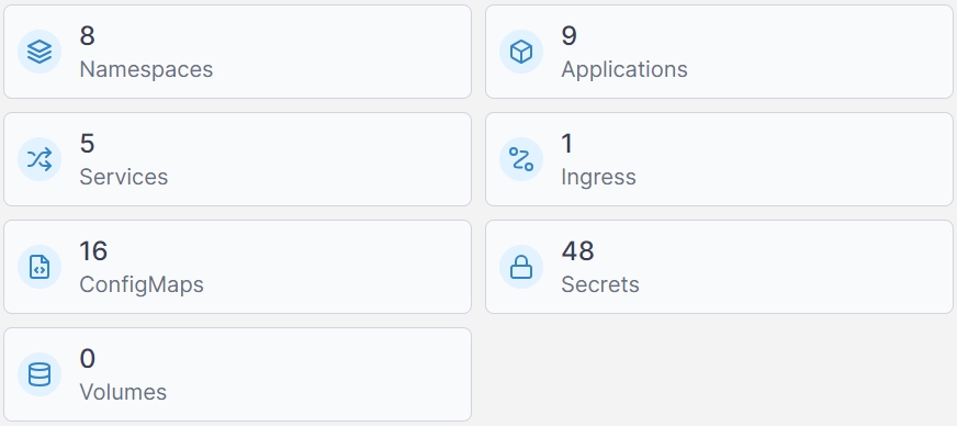 The remaining dashboard is made up of tiles showing the number of namespaces, applications, services, ingresses, ConfigMaps, secrets, and volumes that make up the environment.