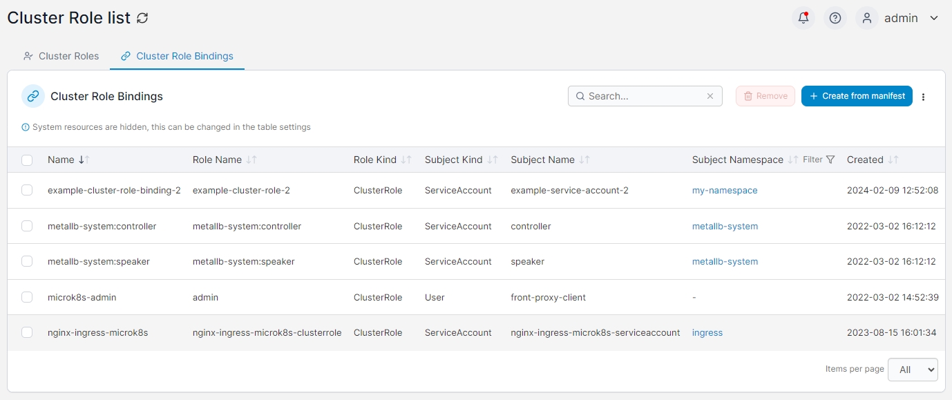 This section lists the Cluster Roles and Cluster Role Bindings on your Kubernetes cluster. New Cluster Roles and Cluster Role Bindings can be created via the Create from manifest button.