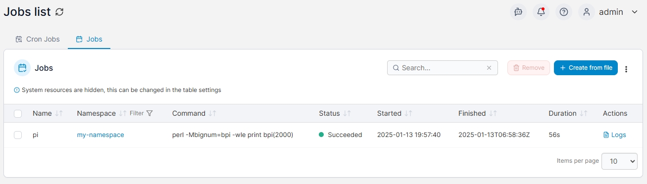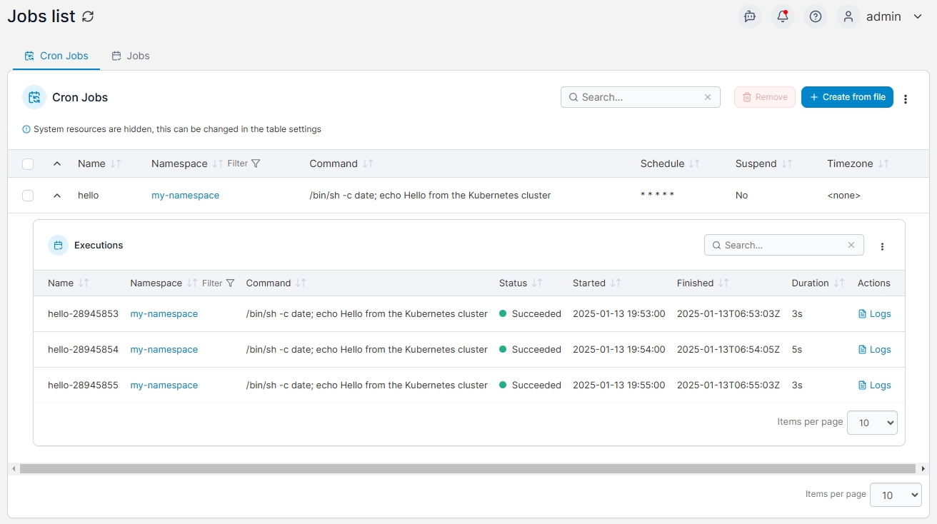 This section lists the Cron Jobs and Kubernetes Jobs on your Kubernetes cluster. New cron jobs and Kubernetes Jobs can be created via the Create from file button.
