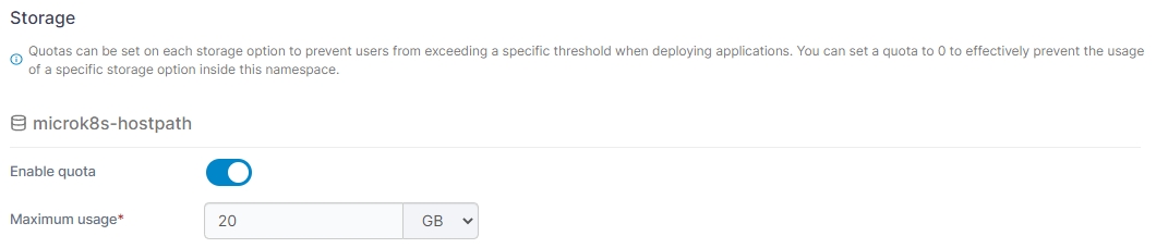 Use this section to enable quotas on your storage options for this namespace. To enable the use of quotas on a storage option, toggle Enable quota to on and set the Maximum usage. A Maximum usage value of 0 effectively prevents the usage of that storage option within the namespace.