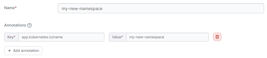 Give the namespace a descriptive name. As an optional step you can add annotations to your namespace as required by clicking Add annotation and filling in the Key and Value fields.