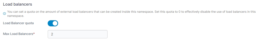 To set a maximum number of external load balancers that can be created inside the namespace, toggle on Load Balancer quota and set the Max Load Balancers number. If Load Balancer quota is enabled and the Max Load Balancers value is set to 0, the use of external load balancers is effectively disabled in the namespace.