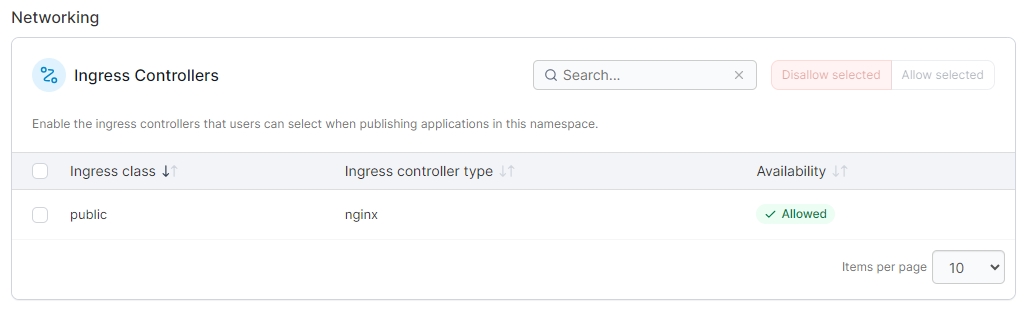 This section lets you define which ingress controllers are allowed to be used to publish applications within this namespace. Check the boxes next to the ingresses you want to allow and click Allow selected, or click Disallow selected to disallow their use in this namespace.