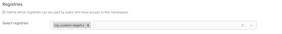 You can define the registries that are available within this namespace in this section. Select the registries from the Select registries dropdown to allow access.