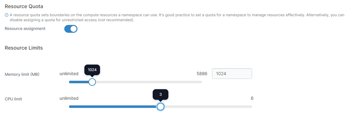 You can assign a quota by toggling Resource assignment on, then setting resource limits like how much memory and CPU will be assigned.