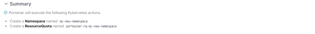 This section displays a summary of the actions that will be taken when clicking the Add namespace button.