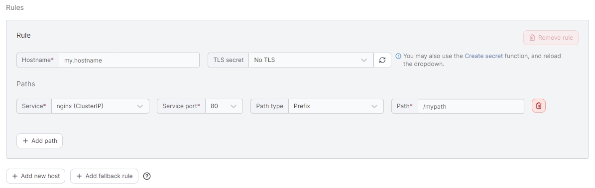 Select the TLS secret that holds the SSL certificate information for the hostname entered above. Optionally, create a new TLS Secret by clicking on the Create secret link (opens in a new tab). Once secret is created click on the reload button next to the TLS secret dropdown and select the new secret.