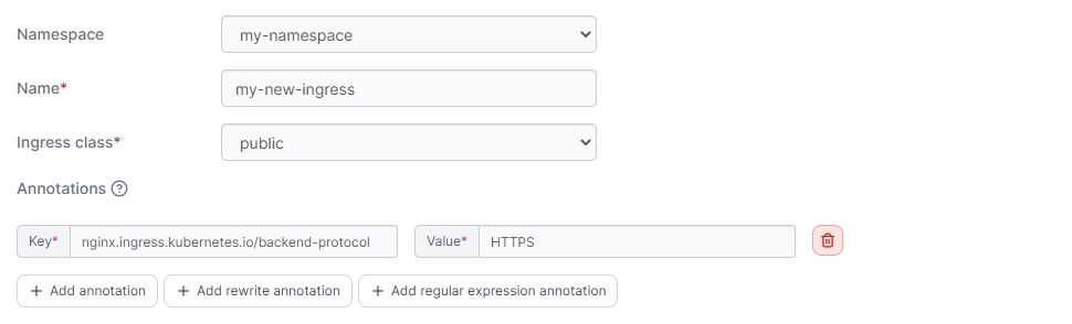 You can add annotations to your ingress as required by clicking Add annotation and filling in the Key and Value fields. Depending on your selected ingress class you may also be able to add rewrite annotations and/or regular expression annotations.