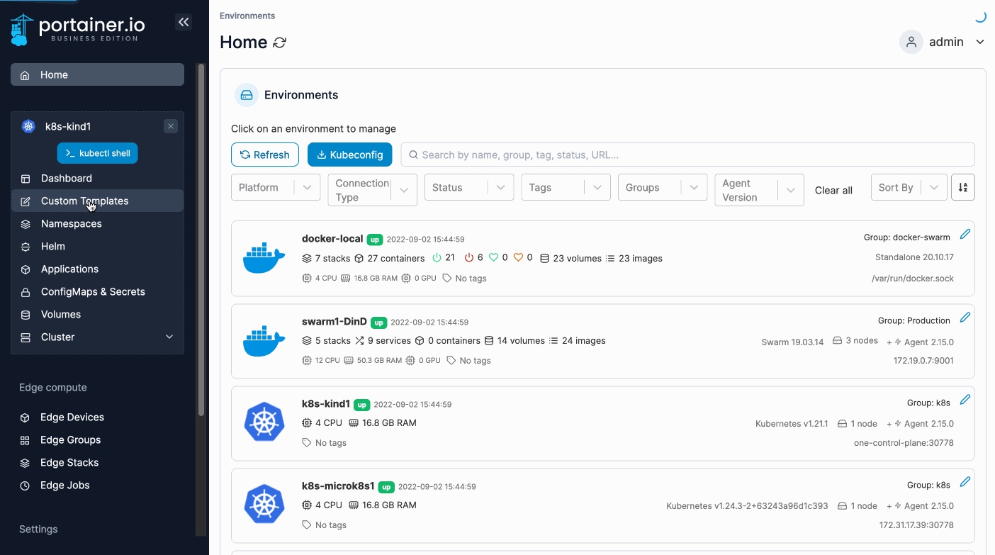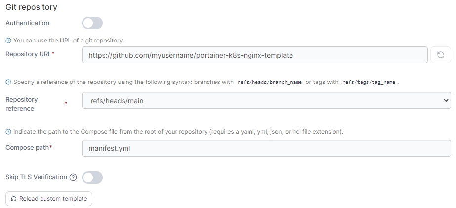 If your template is deployed from a Git repository, you will have the option to edit the Git settings if required. You can also click Reload custom template to update the template from the remote repository.