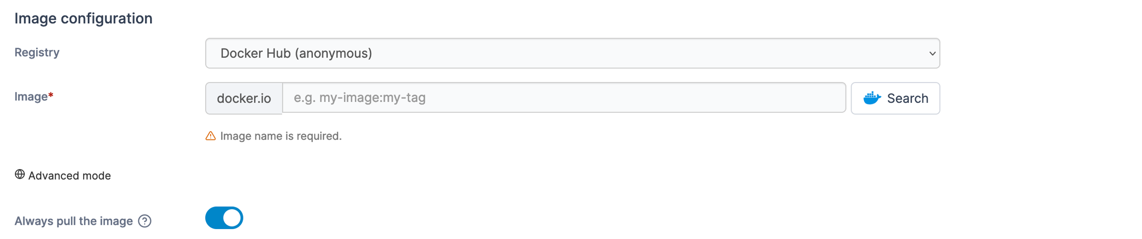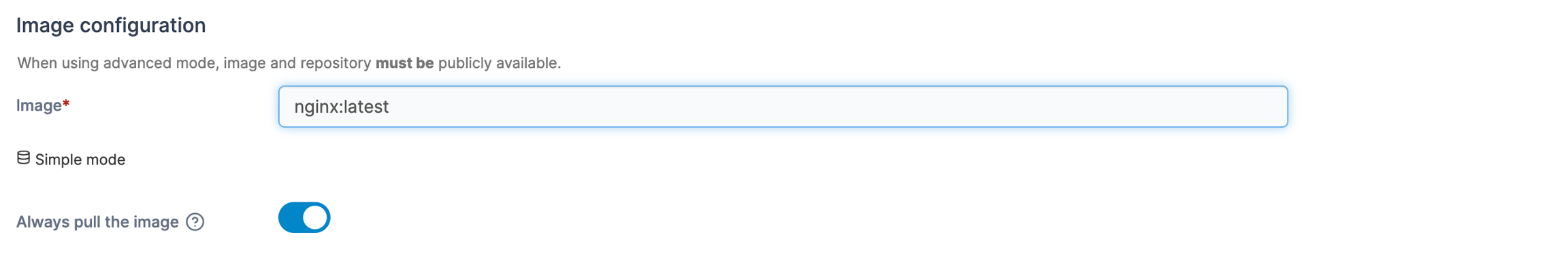 Toggle on to enforce pulling the image from the registry instead of using the locally cached copy (if you have used the image previously).