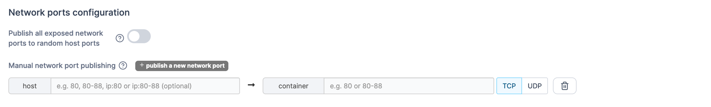 Click publish a new network port to create manual port mappings for the container.