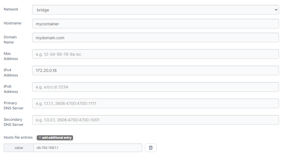 Click add additional entry to add a new host file entry for the container. Host file values should be formatted as hostname:address (for example database:192.168.1.1).
